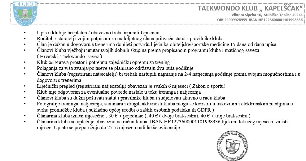 O NAMANaš klub osnovan je 2007. godine u Stubičkim Toplicama s ciljem da okupi djecu, mlade i sve zainteresirane za Taekwondo – bilo kao sport, vještinu ili rekreaciju. Do 2014. treninzi su se održavali u Oroslavju, a od tada smo stalno smješteni u našoj dvorani na adresi Zagrebačka 10, Stubičke Toplice. Fokus našeg rada je kvalitetno i organizirano provođenje slobodnog vremena za predškolsku i školsku djecu. Kroz treninge potičemo razvoj motoričkih sposobnosti u skladu s dobi djeteta, a onima koji žele više, nudimo mogućnost usmjerenja prema natjecateljskom Taekwondou – bilo da se radi o formama (poomsae), borbama po WT ili ITF pravilima. Treninzi se odvijaju u manjim grupama (do 20 vježbača), a vodi ih stručni tim trenera s licencama Hrvatskog Taekwondo saveza i završenim obrazovanjem na Sportskom učilištu – sukladno Zakonu o sportu. Naša dvorana je potpuno opremljena za sve programe – od škole Taekwondoa do rekreativnih i natjecateljskih treninga. Na raspolaganju imamo 85 m² tatamija, strunjače, vreće, štitove, fokusere i ostala trenažna pomagala. Uz dvoranu se nalazi i otvoreni prostor koji koristimo za vanjske treninge. Bez obzira jeste li početnik ili imate sportske ambicije – kod nas ćete pronaći stručnost, podršku i motivaciju za napredak.